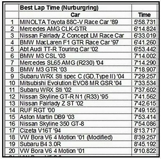 頭兩位紀錄保持者是保時捷956, 最快圈速6分11秒, 較Gran Turismo 4裏面示範車手揸的平治銀箭C6 慢。在Gran Turismo 4內要攞金盃, 標準成績要5分47秒。
