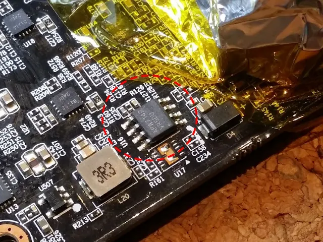 他指出Diode 旁邊那隻 APW1742 係問題元兇,它負責5V供電給上述的mosfet controller,它有問題會導致GPU clock speed 不穩,及它旁邊兩只供電給memory 的 mosfet 「22CA N7CC」 變得很熱。